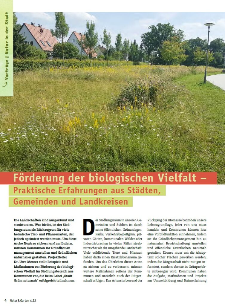 Um die biologische Vielfalt im Siedlungsgrün zu fördern, bedarf es mehr als nur Blühwiesen anzulegen. Es muß Akzeptanz in der Bevölkerung wie auch innerhalb der Verwaltung und bei den politischen Entscheidungsträgern geschaffen werden. Auch ist di...