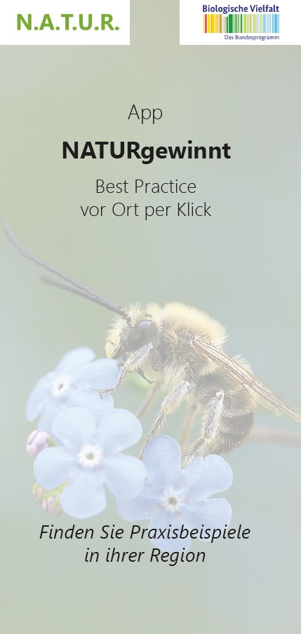 Flyer zur Erläuterung unserer App "NATURgewinnt" - Best Practice vor Ort per Klick. Mit dieser App können Sie vorbildliche naturnahe Flächen und herausragende Stadtnatur-Maßnahmen in Städten und Dörfern digital kennenlernen und durch genaue GPS-Lo...