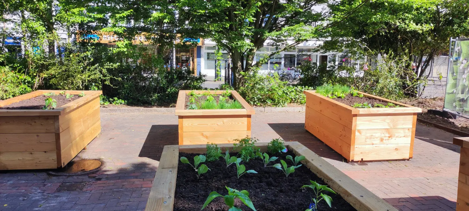 Die Tische in Oldenburg sind nicht nur für Insekten reich gedeckt, sondern auch für die Oldenburgerinnen und Oldenburger – und dies mitten in der Stadt. Auf dem ehemaligen Parkplatz des abgerissenen Finanzamtes stehen statt Autos große Hochbeete mit Paprika, Salat, Schnittlauch, Kapuzinerkresse oder Kohlrabi. Hier kann die Bevölkerung ernten und sich auf der temporären Parkfläche nebenan erholen – viele Oasen für Tiere, Pflanzen und den Stadtmenschen.