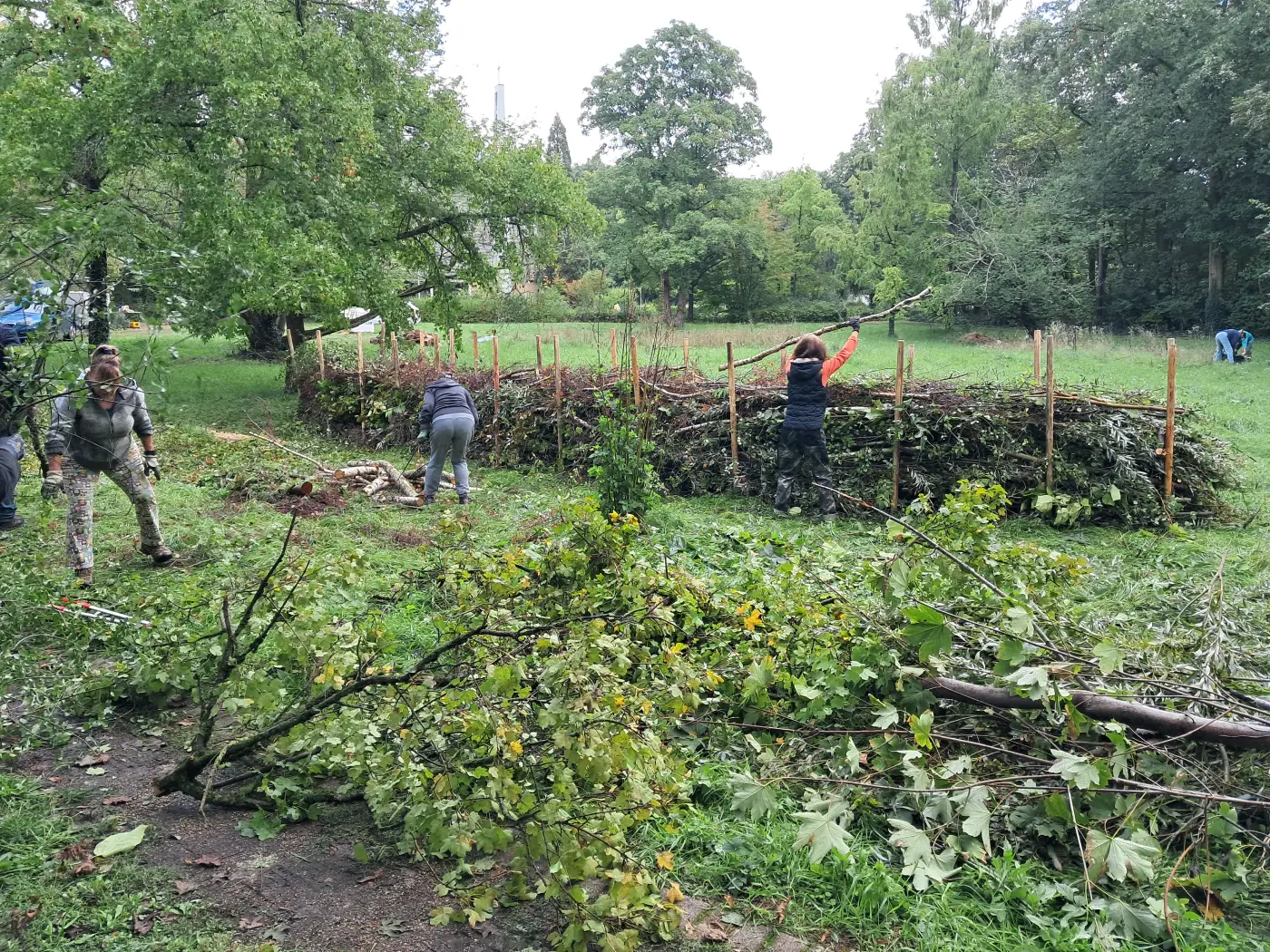 Entlang einem Randbereich des Geländes entstand außerdem eine große Totholzhecke. Sie besteht aus übereinandergeschichtetem Totholz und bietet etwa Igeln und Vögeln Unterschlupf.
