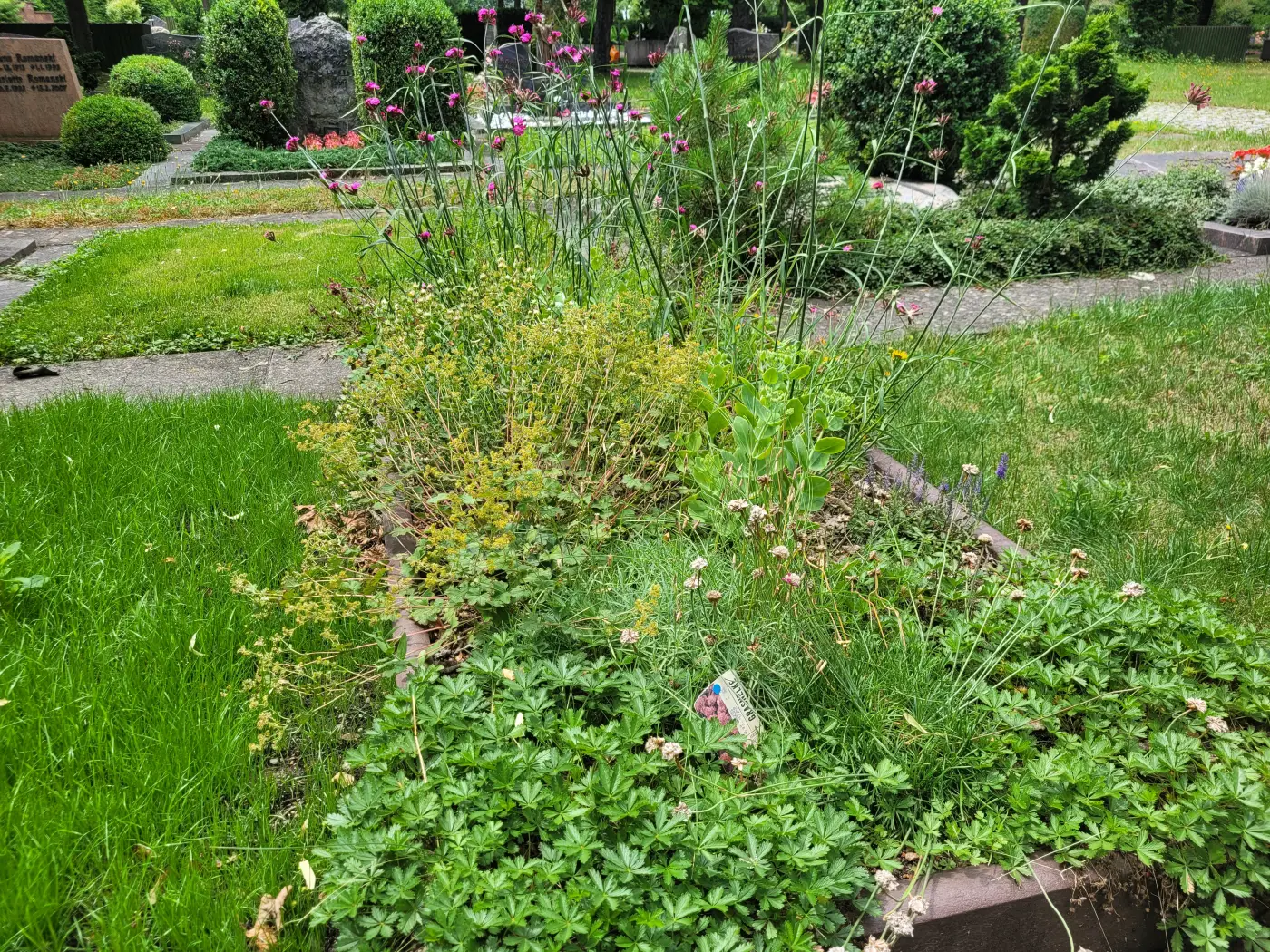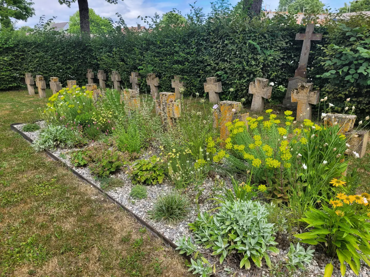 Auf den Soldatengräbern entfällt die bislang traditionelle Bepflanzung mit Wechselflor. Stattdessen wurde eine Mischung bunter, standortgerechter Stauden gepflanzt. Zur Inspiration für eine dauerhafte und pflegeleichte Grabgestaltung wurden drei Mustergräber für unterschiedliche Lichtverhältnisse angelegt. Ein Flyer gibt Friedhofsbesuchern Anregungen und praktische Tipps für eine ökologische Grabpflege.