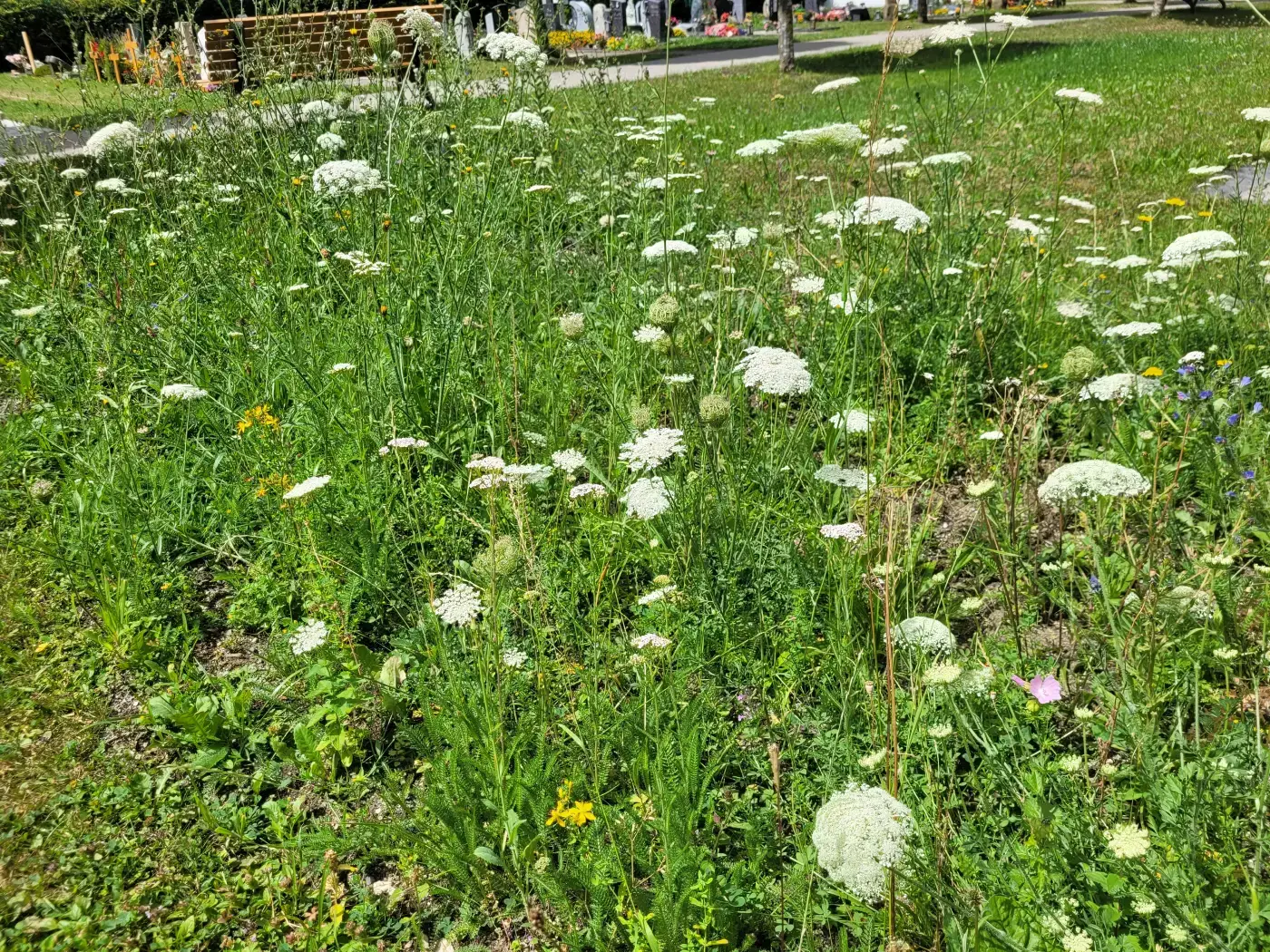 Im Rahmen des Projektes „Lebendiger Friedhof“ wurden auf dem Stadtfriedhof in Bad Dürrheim bislang regelmäßig gemähte Rasenflächen durch die Einsaat von Regiosaatgut zu artenreichen Blumenwiesen umgestaltet. Diese werden wie klassische Heuwiesen nur zweimal im Jahr gemäht. Auf sonnigem Standort entsteht so ein blüten- und artenreiches Habitat für allerlei Insekten und Vögel, ergänzt durch verschiedene Nistkästen.