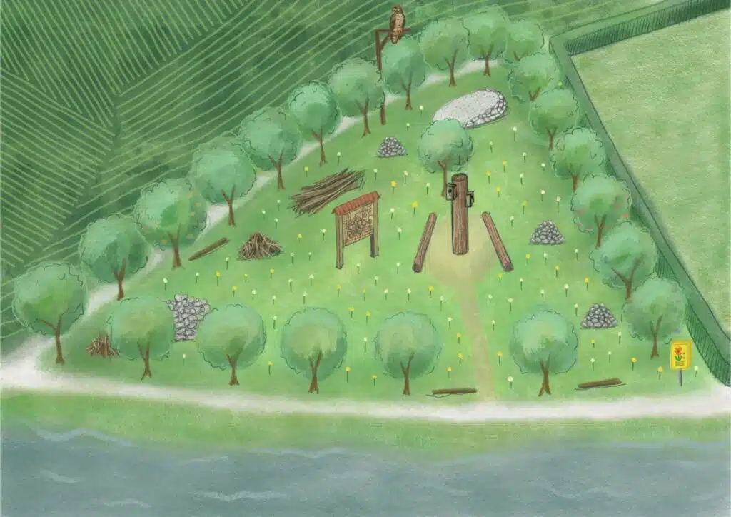 Es entstand auf einem städtischen Grundstück am Rhein – direkt an einem beliebten Fuß- u. Radweg – ein Park der Artenvielfalt, der u.a. einen zentralen u. beschilderten Aufenthaltsplatz, verschiedene Nisthilfen für Kleintiere und Vögel, ein Insektenhotel, eine Trockenmauer, Baumpflanzungen, einen Bienenfutter- automaten u. anderes mehr umfasst. Der neue Platz lädt nun die Öffentlichkeit zum Verweilen u. zur Auseinandersetzung mit der Natur ein.